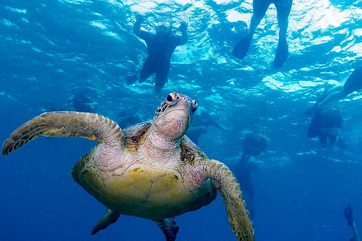 Float effortlessly over rich, colourful coral gardens teeming with life from the cute and playful clownfish to the graceful beauty of the green turtle. Giant clams, stingrays, maori wrasse, cods and colourful parrotfish are just some of the hundreds of species you will encounter during your visit to Opal Reef with Calypso.