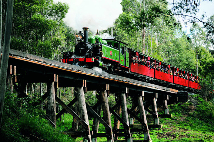 After morning tea, we continue onto the town of Belgrave, where we join the next phase of our journey aboard the Puffing Billy Steam Train. Over 100 years old, the steam train locomotive hauls its passengers from Belgrave to Menzies Creek through green temperate rainforests which are filled with tree ferns, and wonderfully tall trees.